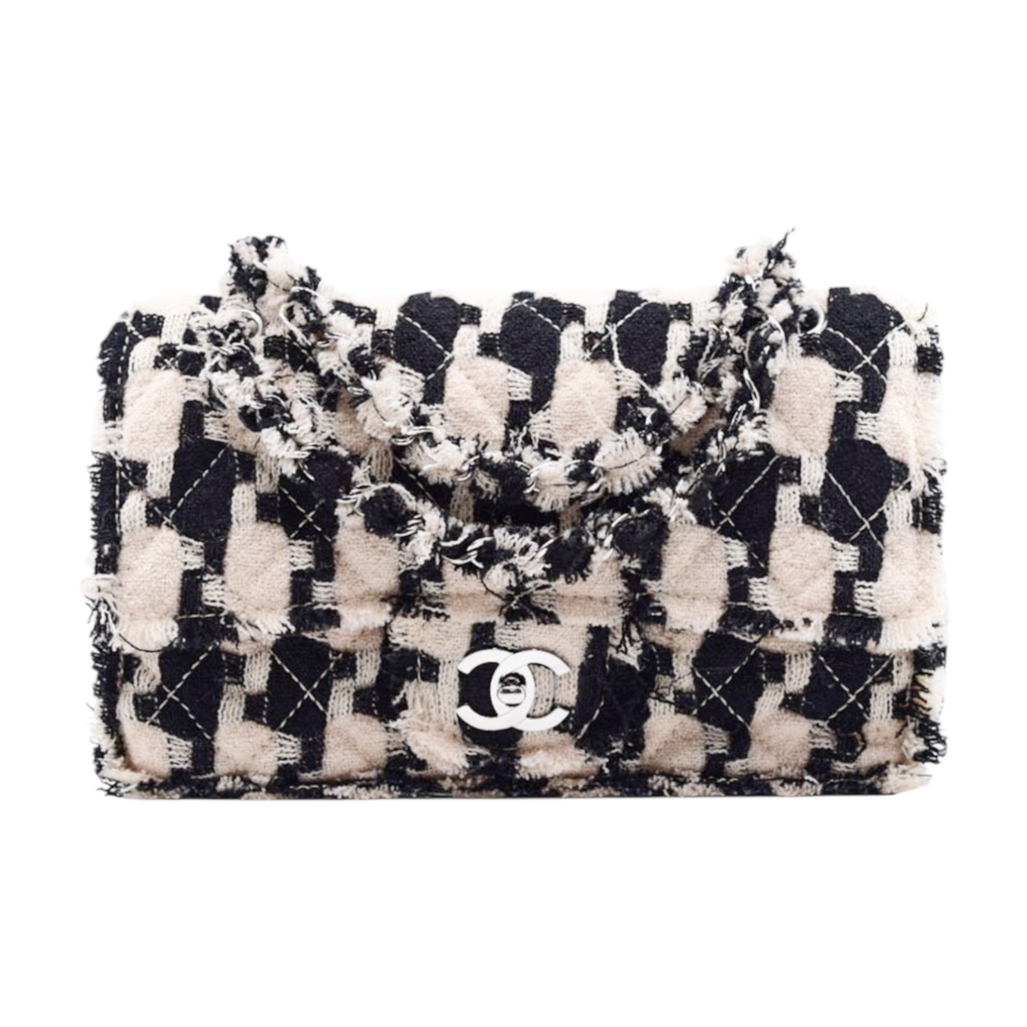 The classic double-flap silhouette opens to reveal a thoughtfully organized interior with a zip pocket, slip pockets, and a pen compartment—perfect for keeping daily essentials secure and accessible. The signature CC turn-lock clasp adds a polished finish, while the leather-interwoven chain strap provides versatile carry options: wear it doubled at the shoulder or lengthened for crossbody styling.