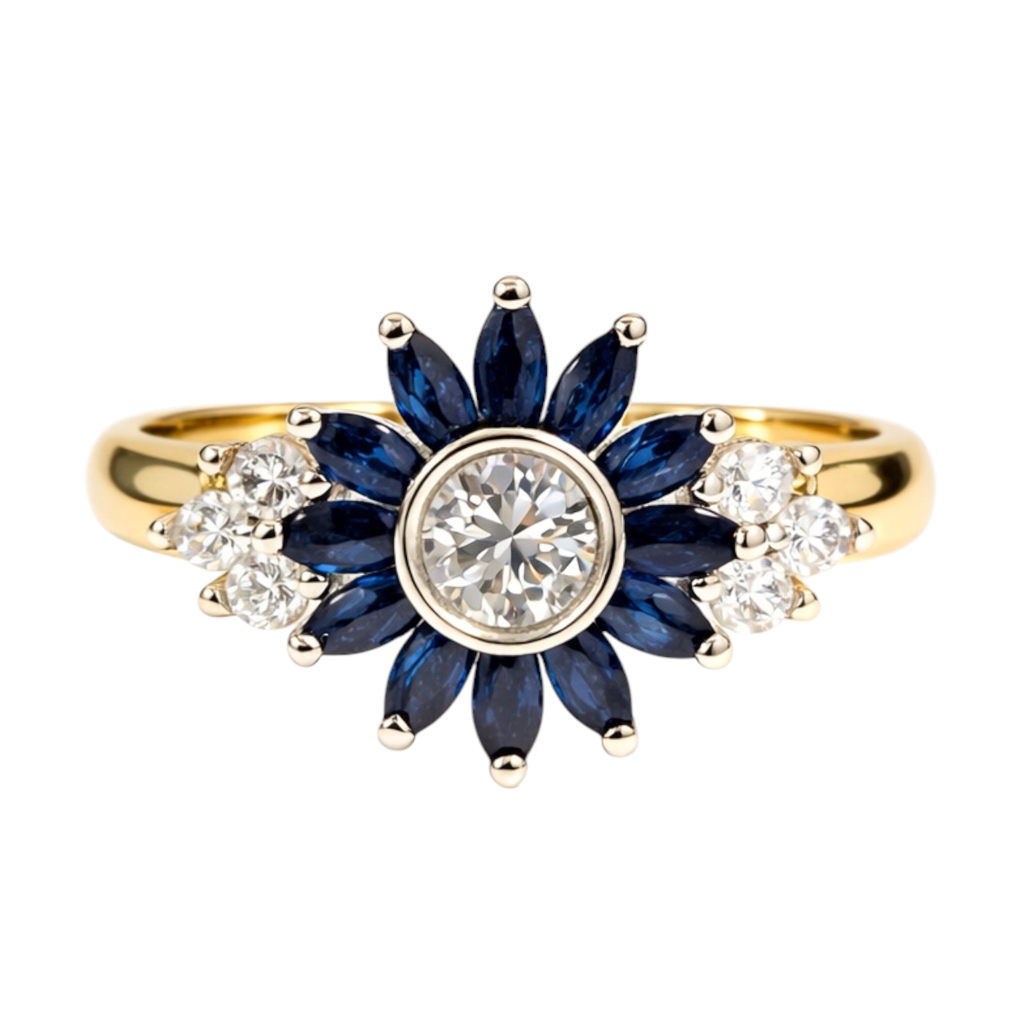 0.25ct center Diamond , 0.69ct Sapphires and 0.48ct side Diamonds set in 18k yellow gold